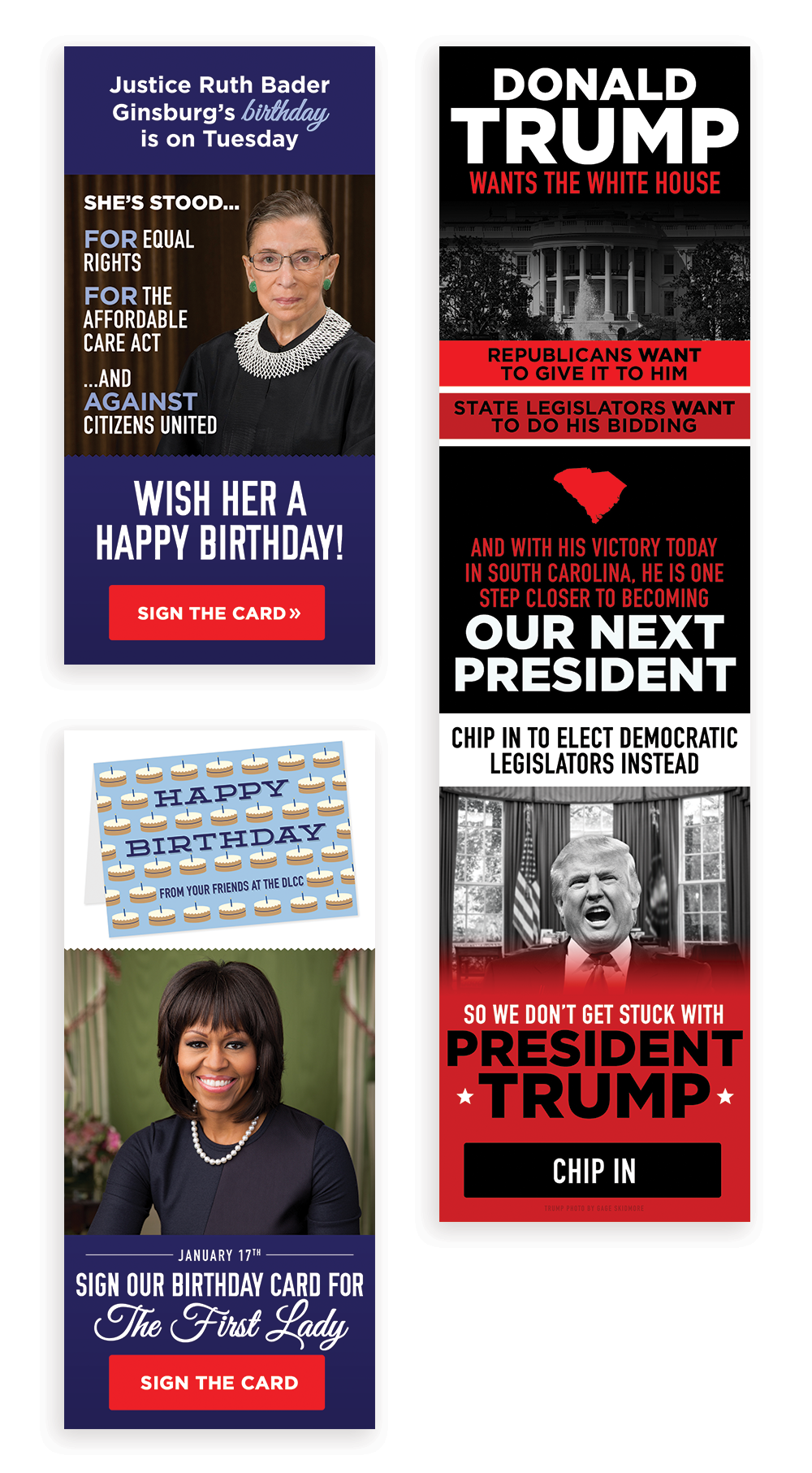 In my time at Rising Tide Interactive, I’ve designed and provided creative direction for Democratic committees including the Democratic Governors Association, Democratic Legislative Campaign Committee, Democratic Congressional Campaign Committee, Democratic National Committee, and more.