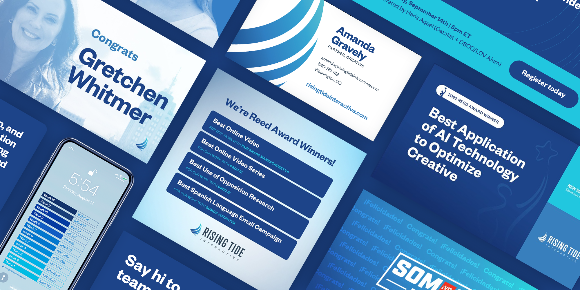 Rising Tide Interactive is a firm providing digital strategy at the speed of campaigns. Since 2014, I’ve been responsible for leading design of the company’s visual brand, pushing continual visual development and ensuring correct usage across platforms to position the company as an established and experienced firm in the digital Democratic space.