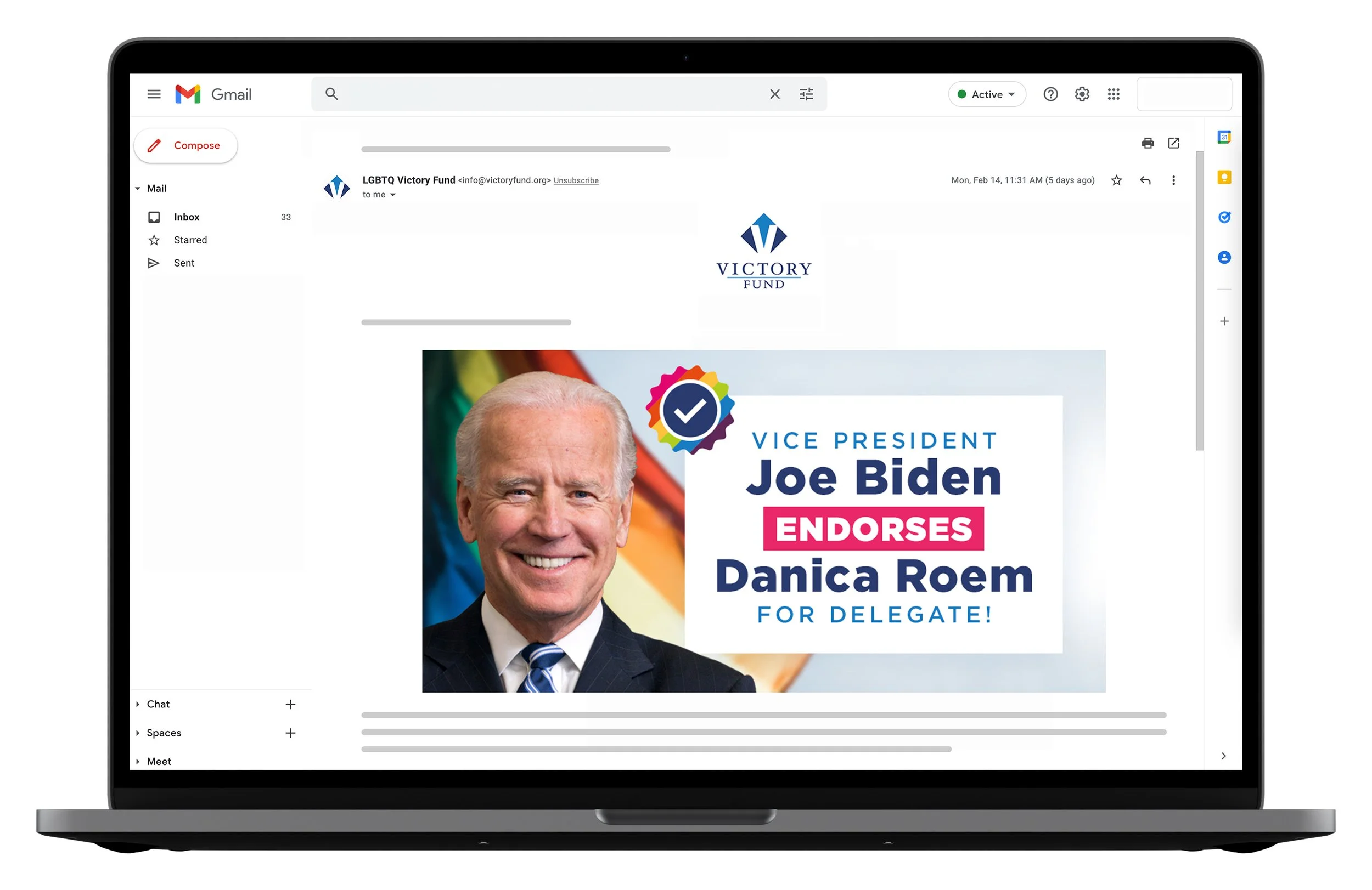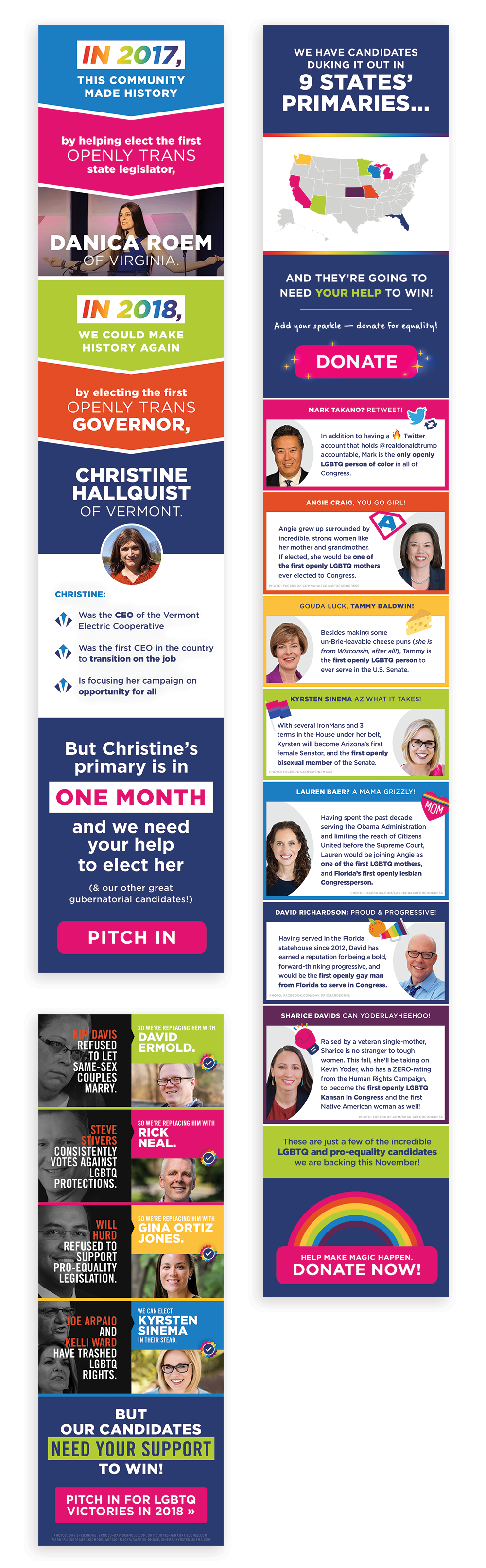 Full graphic emails created for LGBTQ Victory Fund on behalf of Rising Tide Interactive in 2017. These email graphics were sent as image-only emails to add variety to the types of emails we were sending to the email list audience. They were designed with scrolling in mind, and they were sliced and saved as smaller pieces to ensure quick loading in inboxes.